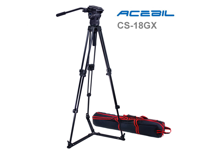 The CS-18GX Professional Tripod System from Acebil includes a 75mm CH1 fluid head, T705GX and an S-52 carry case. The tripod features a single-stage design and aluminum construction that supports loads up to 10kg / 22lb. It provides a height range from 96cm-156cm / 38"-62" and comes equipped with a sliding quick-release plate and pan bar.