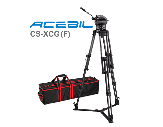 The CS-XCG(F) Professional Tripod System from Acebil includes a 150mm CHX fluid head, T3002C carbon fiber tripod, GS-5 ground spreader, and an SC-110 carry case. The tripod features a two-stage design and Carbon Fiber construction that supports loads up to 50kg / 110lb. It provides a height range from 63-171cm / 24.8”-67.4” and comes equipped with a sliding quick-release plate and pan bar.