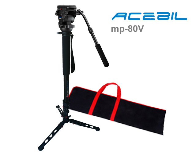 mp-80V(N) / S-11This mp-80V(N) Carbon Fiber Monopod from Acebil combines the mp-E180 monopod with the H805 video head. It can hold up to 5kg / 11.0lb, and extends from 87-150cm / 34.2-59”. The improved floor spreader provides added stability, and its ball joint allows for smooth pan and tilts. Its four sections are secured in place with twist locks, and a foam grip and wrist strap add comfort and security. The H805 video head has a tilt angle of +90° / -65°m, and its included quick-release plate has a 1/4" slide range. A soft carrying case is included to protect the MP-80V(N) when not in use.