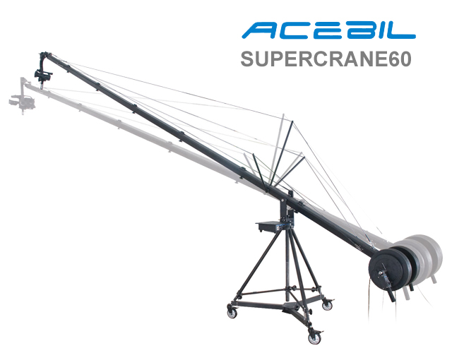The Supercrane60 is a camera jib with 18’ total arm length and 15.4’ maximum lens height. It offers complete remote control of lens height and pan-tilt head and is designed for use with ENG camcorders with a Canon or Fujinon lens and LANC-enabled Canon/Sony (H)DV or Panasonic DV, HD handheld camcorders. The jib's main components are the Jib arm, Pan-Tilt Remote Head, Controllers (control box and remote control bars for head and camera), Tripod, and Dolly. The complete jib set fits into two hard cases (one larger roller case and a smaller suitcase).